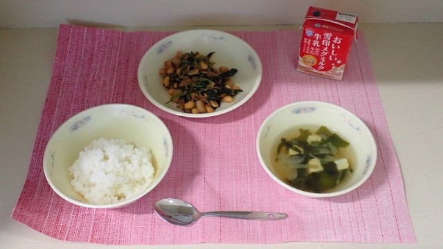 「肉みそいため」は、しっかりしたみその味が食欲をそそる献立です。大豆や豚肉、こんにゃくなどの具にからんだみそのコクやうま味を感じながら、おいしくいただきました。いつも以上にごはんもおいしくいただくことができました。