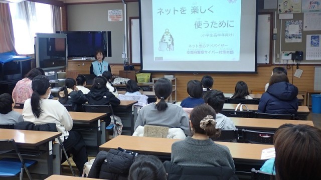 1月31日(土)、PTA主催の家庭教育学級が開催されました。「スマホ講座」として、京都府警察ネット安心アドバイザーの方を講師としてお招きし、「インターネットの危険性と情報モラル」「闇バイトの危険性」についてお話をしていただきました。