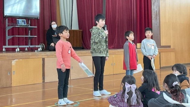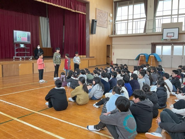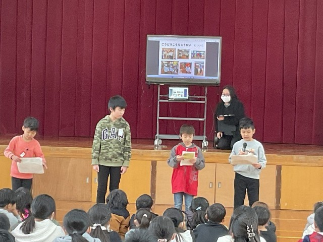 はじめに、梅津北小学校との「二校交流会」、太秦小学校と南太秦小学校を加えた「四校交流会」、そして支部の「合同交流会」の様子をそれぞれ発表しました。お客さんとして来た1年生と6年生の子どもたちは、交流会の様子について興味をもって聞いていました。