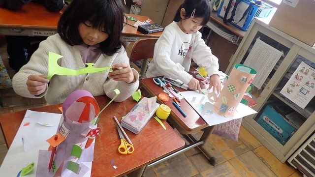 2年生は、図工の「まどを あけたら」の作品づくりをしています。
