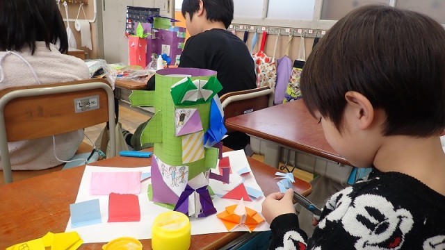 つくりながら、「これをつくろう」「あれもつくりたい」と、どんどん思いが広がってきました。「これで完成!」と思っても、ちょっと友達や先生にみてもらうと、もっとつくりたいところが出てきました。それぞれ、自分の思いをいっぱいに表現した作品ができあがりました。作品は、来週開催する校内作品展で展示します。どうぞ子どもたちの力作を見にお越しください。