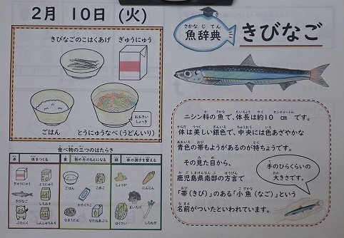 「きびなご」は、ニシン科の魚で体調は約10センチメートルです。体は美しい銀色で、中央に色鮮やかな青色の帯の模様があるのが特徴です。その見た目から、鹿児島県南部の方言で、「帯(きび)」の「小魚(なご)」という名前がついたといわれています。今日は、衣がさくさくのこはく揚げにしておいしくいただきました。