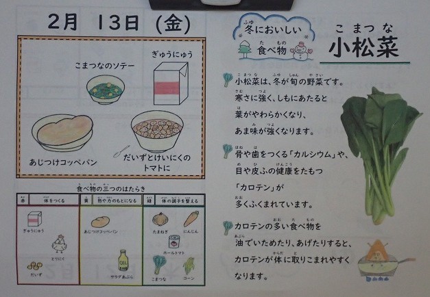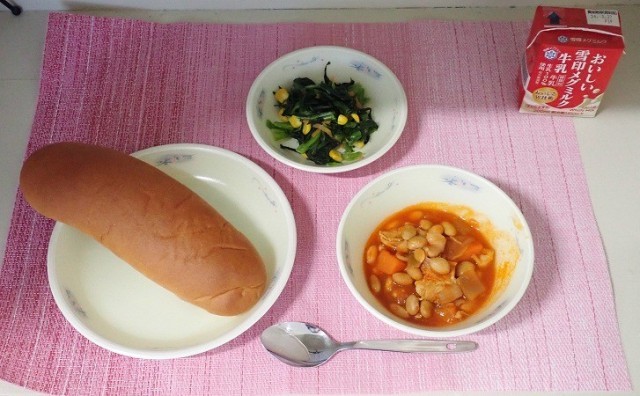 「大豆と鶏肉のトマト煮」は、さっぱりしたトマト味の酸味が魅力の献立です。鶏肉がとてもやわらかく調理されていて、ほくほくの大豆と一緒においしくいただきました。食べ応え満点の献立でした。今日の「小松菜のソテー」には、コーンが入っていていろどりもあざやかです。味だけでなく、見た目も楽しんでおいしくいただきました。
