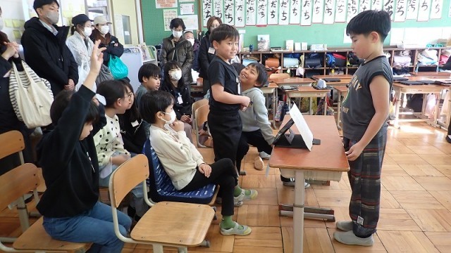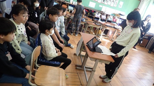 学校の中にある「自分のお気に入りの場所」について、聞く人にわかりやすく伝えるための学習をしてきました。今日は、クラスの友達と「お気に入りの場所」を紹介し合う交流会を開きました。今日は授業参観なので、聞き役にはクラスの友達だけでなくたくさんの保護者の方も来てくださいました。話し手は、「間の取り方」「聞き手を見て」「聞きやすい声」などに気を付けて話し、聞き手は「最後まで静かに」「うなずきながら」などを意識して聞きました。