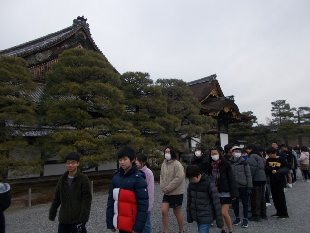 次は、二条城に到着しました。二の丸御殿では、鴬張りの床を歩き出すと、早速当時の徳川家の権力の大きさを示すかのような襖絵の虎の絵に驚き、大政奉還の場とされる大広間では、四方を壮大で豪華絢爛な装飾に目を奪われました。その後は、庭園をゆっくり散策し、二条城の規模の大きさを実感することができました。