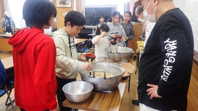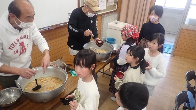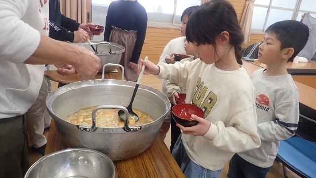炊きあがったごはんでみんなでおにぎりをつくりました。いよいよ豚汁もできあがり、いよいよみんなで一緒にお昼ご飯をいただきます。低学年の子どもたちから順番に豚汁をよそい、みんなでいっしょに「いただきます」をしました。