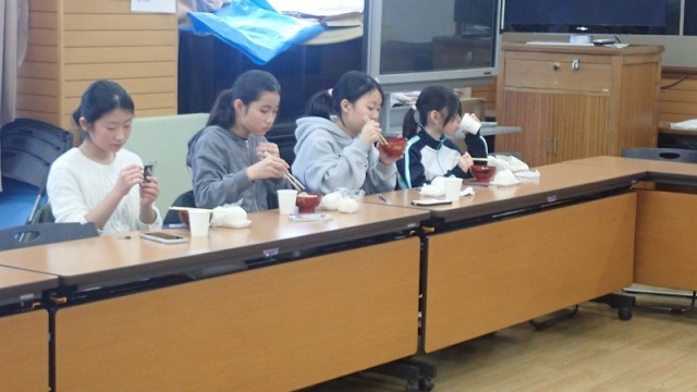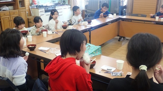 自分たちでつくった豚汁は、やっぱり特別だったようです。みんな「おいしい」と言いながらいただきました。豚汁もおにぎりもたっぷりあったので、何回もおかわりをしていました。お鍋が空っぽになり、最後のおにぎりもなくなったら、みんなで「ごちそうさま」をしました。
