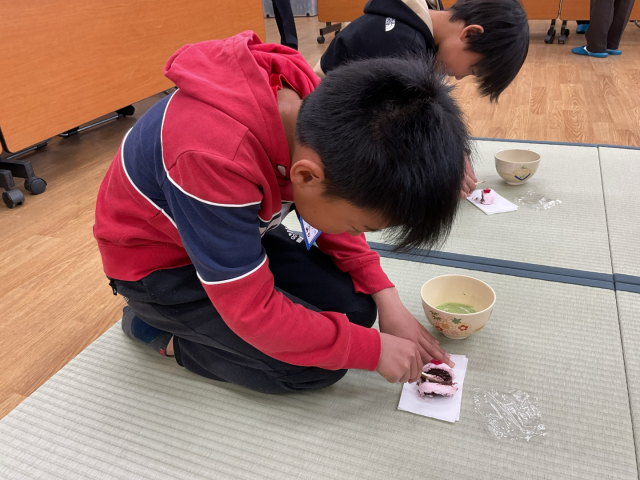 点てていただいたお茶を飲んだり、自分でお茶を点てたりして茶道に親しみました。授業の終わりにはたくさんの感想や質問をする子たちの姿が見られ、良い経験が出来たことがとても伝わってきました。