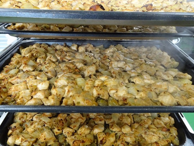 「鶏肉の中華みそ焼き」は新献立です。たまねぎや白ねぎ、しょうが、にんにくなどの料理に香りをつけ、味を良くしてくれる「香味野菜」を使った献立です。白みそのやさしいあま味が香味野菜の風味とよく合います。鶏肉と香味野菜をみそに漬け込んで、スチームコンベクションオーブンで焼いて調理しました。