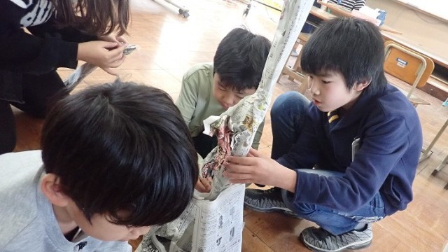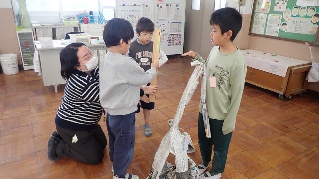今日は、みんなで「新聞タワーづくり」をしました。これまでに2回挑戦し、2回目の記録は75.6cmでした。2回取り組んできた中で、子どもたちもコツをつかんできているようで。「ぼくがレンガをつくるよ」「ここに差してみたらどうかな」「倒れそうだから支えをつくろう」など、みんなで協力して高いタワーを立てようと試行錯誤しました。10分の制限時間でできあがったタワーは…104cm!みごと、子どもたちの目標の100cmを越えました。