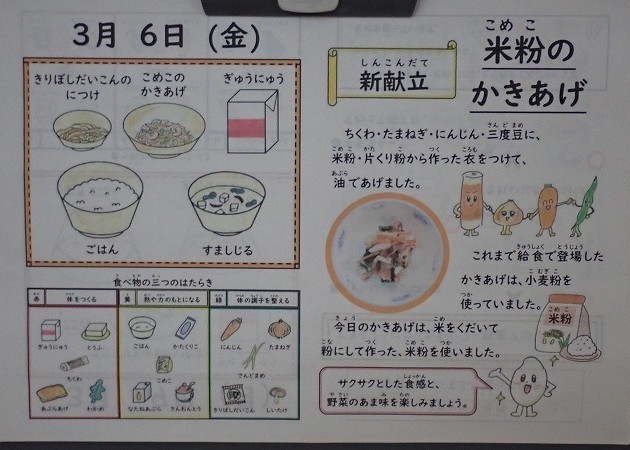 「米粉のかきあげ」は新献立です。ちくわ、たまねぎ、にんじん、三度豆に、米粉、かたくり粉からつくった衣をつけて、油で揚げてつくっています。これまでに給食で食べてきた「かきあげ」には小麦粉が使われていましたが、今日はお米を砕いて粉にした米粉が使われていました。米粉のサクサクとした食感と、ちくわや野菜のあま味を楽しんでおいしくいただきました。