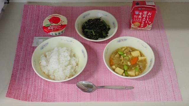 「和風カレーどうふ」は、スパイシーなカレーというより、おだしのうま味がよく出ており、和風の深みのある味を楽しんでいただきました。かたくり粉のとろみもよく、寒かった今日ですが体もぽかぽか温まりました。