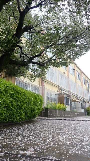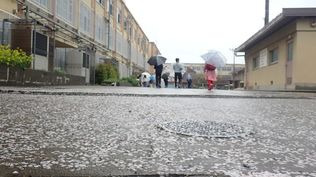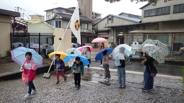 あいにくの雨のスタートになりましたが、2年生から6年生の子どもたちが元気に登校してきました。西門を入ったところは桜の花びらのじゅうたんになっていました。
