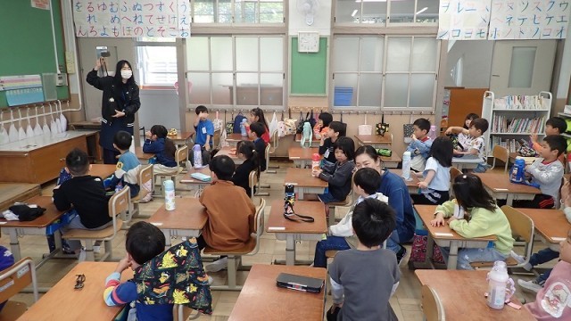 はじめに、ランドセルの片付け方を教わりました。必要なものを机の中にしまって、ランドセルや帽子を教室の後ろのロッカーに片付けました。何をするにもはじめてのことで戸惑いながらですが、だんだんと学校生活の約束事を身に付けていくでしょう。