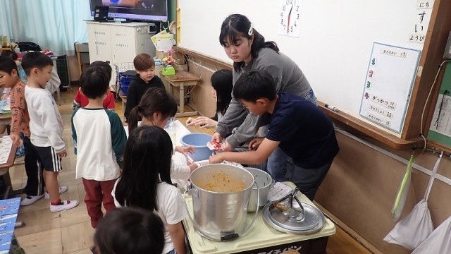 何もかもはじめての1年生なので、手洗いをすることやナプキンの敷き方、給食当番の仕方などを確かめ、いよいよ給食です。配膳には6年生のお兄さんやお姉さんも応援に来てくださいました。「いただきます」をして、おいしい給食をおなかいっぱいいただきました。口の周りがミートソースで赤くなった子がたくさんいたそうです。はじめての給食はどんな味だったか、ぜひおうちで聞いてみてください。