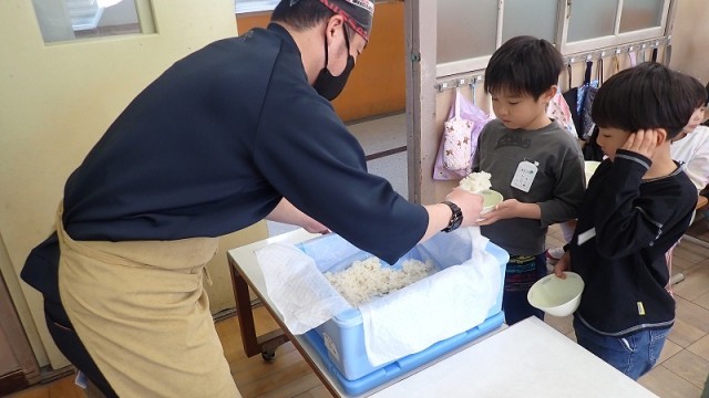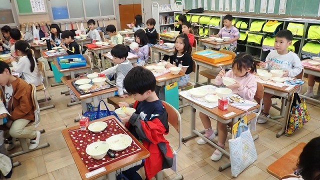 2回目の給食の様子です。昨日は子どもたちが好きなミートソース味のスパゲティでしたが、今日は五目煮豆にすまし汁と、子どもたちにとってはあまり食べ慣れていないかもしれない献立でした。「豆が好きじゃない」「ねぎやしいたけが苦手…」という声も聞かれましたが、食べてみると「おいしい!」と言って喜んで食べる子がたくさんいました。