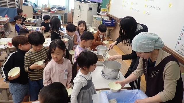 「五目煮豆」以外のお皿は空っぽになっているのに、「五目煮豆」は手付かず…という子がいたので、「昆布とかお豆さんは苦手なんかな?」と聞いてみると、「ううん!これ、おかわりしてん!!」という返事が返ってきました。たくさん食べてくれて、とてもうれしいです!