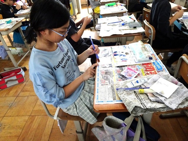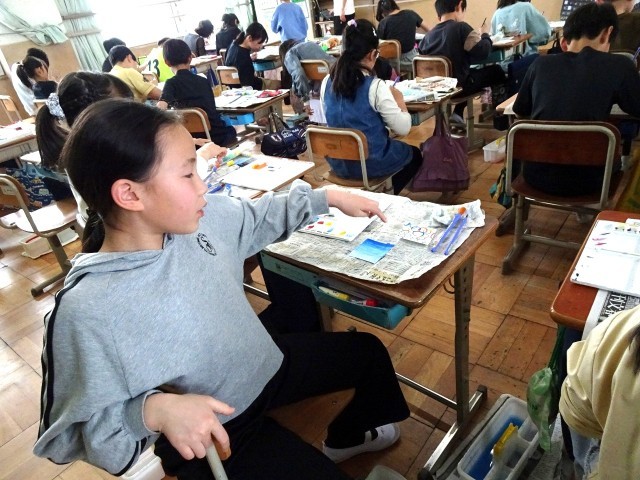 ビー玉を使ったり、スパッタリングやデカルコマニーなど、自分の思いにあった方法を選んだりして画用紙に色をのせていきました。