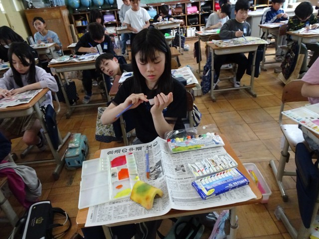 金曜日には、5年生初めての図画工作の学習がありました。4年生までに学んできたいろいろな方法を使って、自由に模様を描いていきました。テーマは「自分の心を表すこと」です。