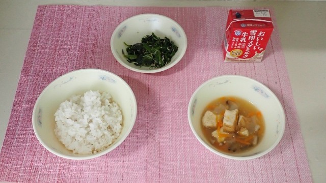 「厚あげの野菜あんかけ」は、大きな厚あげに、たまねぎ、にんじん、干しいたけなどのたくさんの野菜を使ったあんがかかっている献立です。とろみのあるあんは舌触りもよく、ごはんによく合う献立でした。
