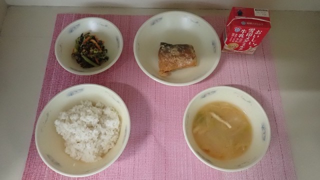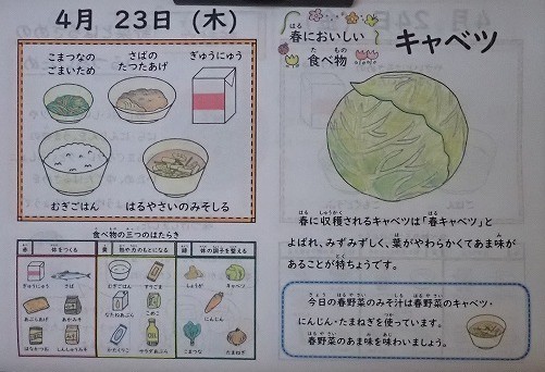「さばのたつたあげ」は、さばの身をからっと揚げた献立です。プリプリとしたさばの身を味わっていただきました。子どもたちが好きな揚げ物なので、魚が苦手な子もおいしくいただきました。「春野菜のみそ汁」には、春に旬を迎える野菜がたっぷり入っています。使われていたキャベツは「春キャベツ」で、みずみずしくやわらかくあま味があるのが特徴です。春においしい野菜を味わっていただきました。