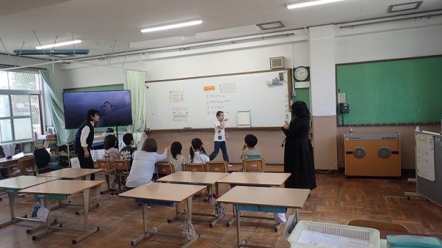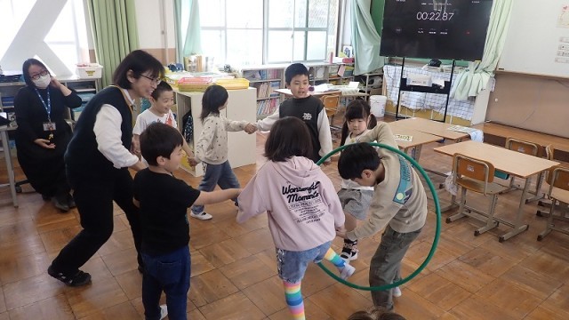 今日は、「カメラゲーム」「みなさんなんですか?」「フープおくり」「ばくだんゲーム」の4つのゲームをしました。新しく迎えた3名の1年生と一緒にゲームをすることで、より仲良くなることができたのではないかと思います。最後の「ばくだんゲーム」では、参観に来られた保護者の方も一緒になって楽しい時間を過ごすことができたようです。