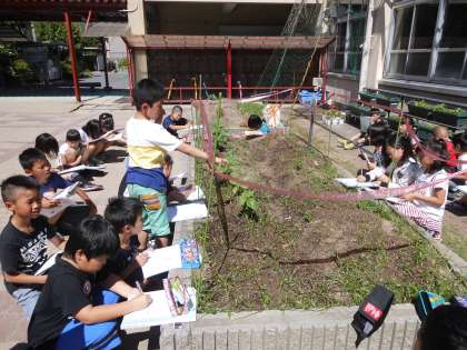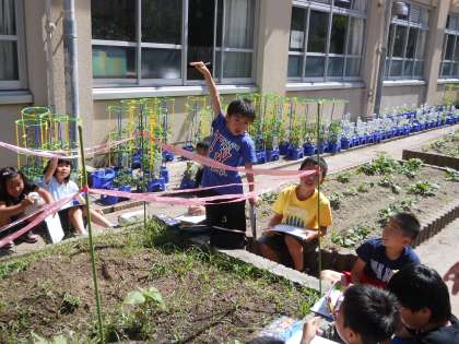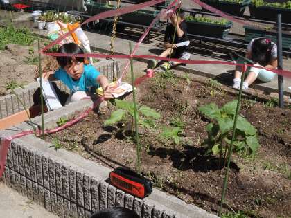 理科では,ひまわりの成長の様子を観察しました。葉の様子や背丈など,観察する視点を確認し,記録していきました。