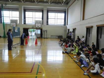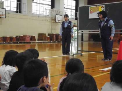 右京警察署の方々,地域の方々,PTAの方々にお世話になり,交通安全教室を体育館で行いました。1年生には,日々,安全に十分気をつけるように,警察署の方から教えていただきました。