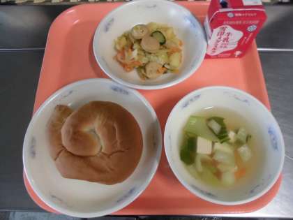 バターうずまきパン・牛乳・ソーセージと野菜のいためナムル・とうふと青菜のスープ
