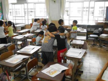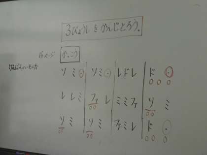 音楽の時間,3拍子を感じ取ろうということで,グループで楽しくリズム遊びをしました。お互いに顔を合わし,そして手を合わしたり肩を組んだりと,リズムにのってとても楽しく活動できました。