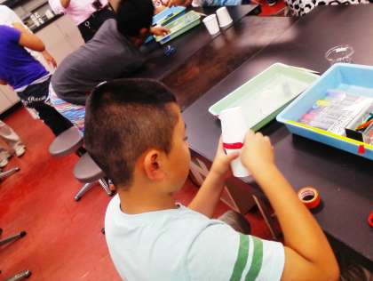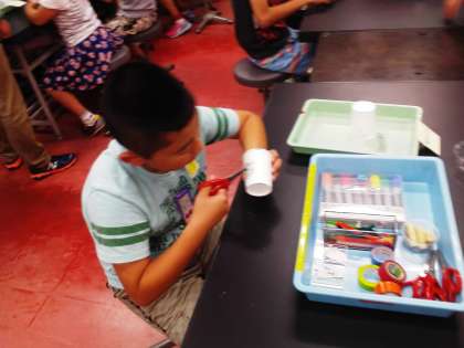 実験室での学習です。「声でくるくるまわしちゃお!」という科学おもちゃ作りをしています。紙コップを3つ組み合わせて声でモールの小物を回します。センターの先生に「どうして回ると思いますか?」と質問をされました。「声の振動で回ると思います。」と予想していました。