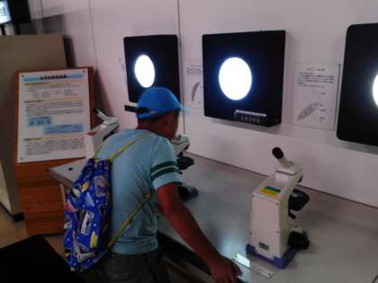 顕微鏡で水中の微生物を観察しました。放射性物質を含む岩石や蛍光岩石、鉱物によって炎の色が変化する展示も見てきました。