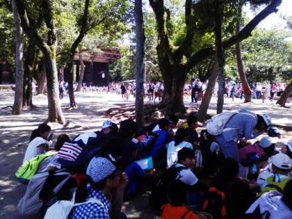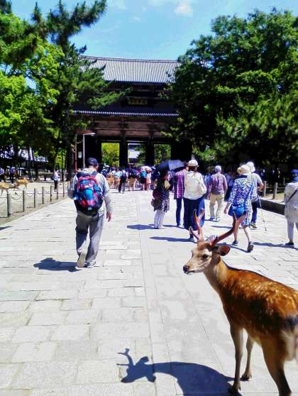 東大寺に到着しました。何頭もの鹿が出迎えてくれました。たくさんの学校から見学に来られています。トイレ休憩の後、境内を見学します。