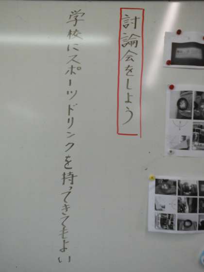 国語では学級討論会に取り組んでいます。第一回目の議題は「学校にスポーツドリンクを持ってきていいか。」。肯定派と否定派に分かれて,司会の進行のもと,討論会を進めていきます。