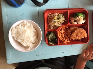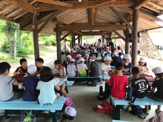 みさきの家に着きました。東屋で昼食です。メニューはハムかつです。みんな、朝が早くて腹ペコです。