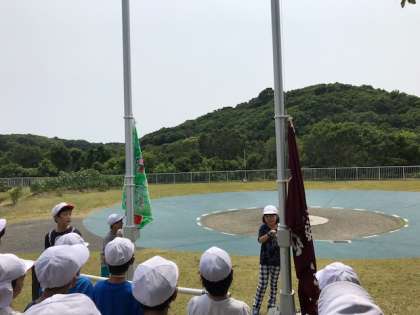 入所式の様子です。みんなで作った旗と、校旗と2つ揚げました。司会の児童、入所の言葉担当の児童、共に、大変立派でした。