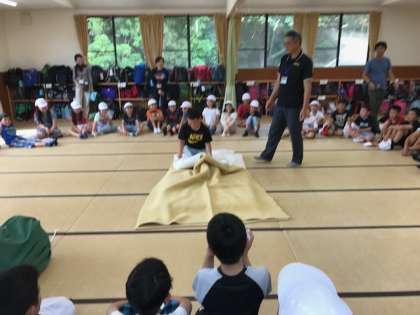 60畳の広間に集まり、布団のしきかたやたたみ方、毛布やシーツのたたみ方を教えていただきました。二人で協力しないとできません。