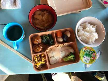 1日目の夕食はサゴシとミートボールです。マスカットゼリーもデザートでついています。みんなで楽しくいただいています。
