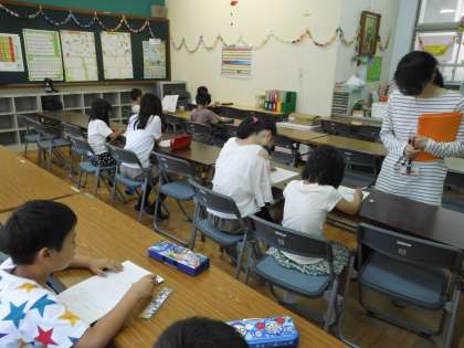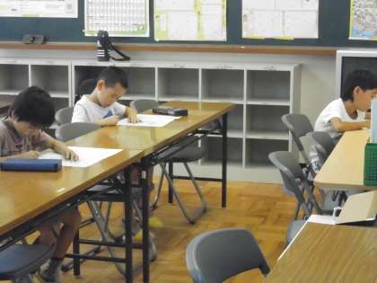 7月8日(土)の算数検定に向けて,学習会を行いました。学習会では,テスト形式で過去問題に挑戦しています。今回1年生も検定に挑戦しますが,入学して間もない1年生にとっては,まだレベルが高いようです。でも,6年生の人が教えてくれたおかげで,問題を解くことができました。