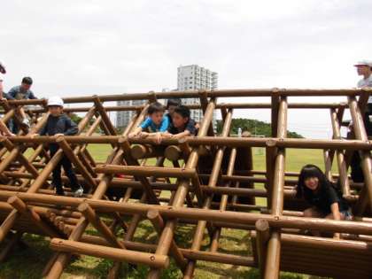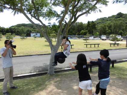 宮崎浜の潮の満ち引きの関係で、磯観察にはまだ少し時間があるようです。思いがけず、リラックスタイムが入りました。東屋の日陰で昼寝をする子もあり、芝生広場で駆け回る子もあり、入所の時から気になっていたアスレチックで遊ぶ子もありで、おもいおもいの時間を過ごしています。