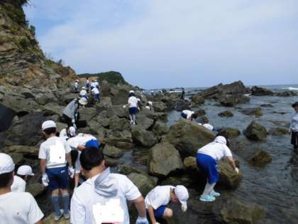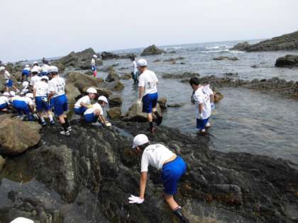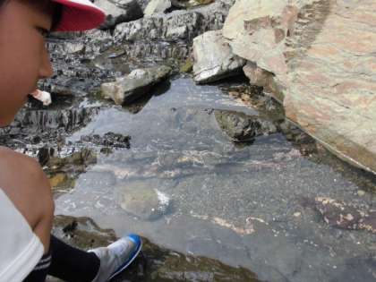 宮崎浜で磯観察を行っています。ヤドカリやカニ、小さな魚などを見つけています。