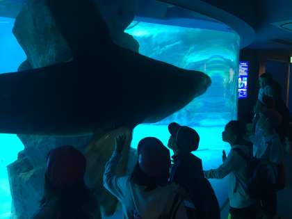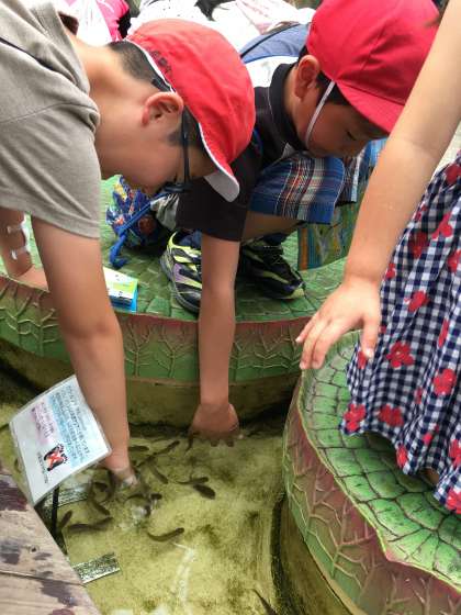 館内の生き物たちと思う存分にふれあっています。