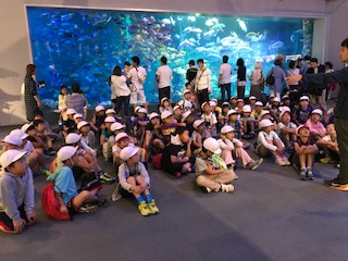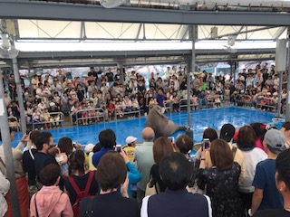 鳥羽水族館のセイウチショーを見学しています。近くまで寄って、からだに触らせてもらいました。楽しいショーでした。