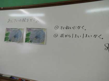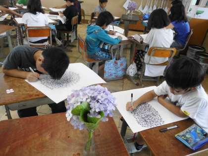 梅雨の季節,校内でもきれいにアジサイが咲いていますが,図工でアジサイの絵を描き始めました。すごい集中力で「見て描いて」「見て描いて」を黙々としています。たくさんのアジサイの花が画用紙上に広がるのが楽しみです。