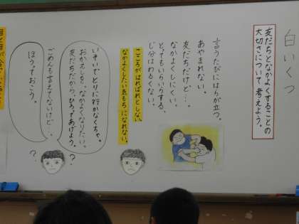 2年生は,道徳の時間を授業公開です。読み物資料を読んで,登場人物の心情を考えました。考えたことを交流する際には,登場人物になり切って演技しながら,友だちと伝え合いました。