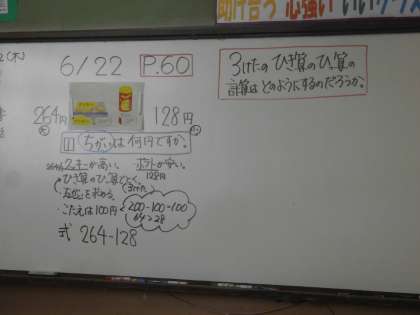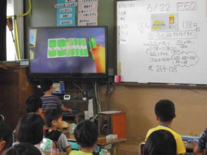 3年生は,算数の学習です。3けたのひき算の筆算をどのようにするか,数え棒を使って考えました。どのように考えたかは,書画カメラで大型テレビに写しながら,みんなで交流しました。