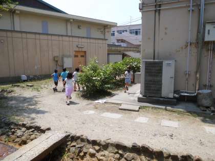 ちびっこ広場で元気に遊ぶ1年生たち。でもチャイムが鳴れば,みんな教室に戻ります。写真は,駆け足で戻っていく1年生たちの後ろ姿です。