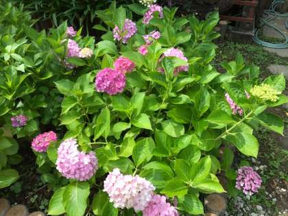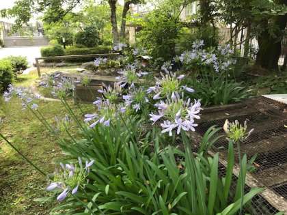 校庭や中庭に,色とりどりの花が咲いています。上段から,「ナツツバキ」別名沙羅双樹です。「平家物語」の冒頭に出てくる『沙羅双樹の花の色,盛者必衰の理をあらはす』で有名です。そして,「ムラサキクンシラン」(アガパンサス),「アジサイ」です。
