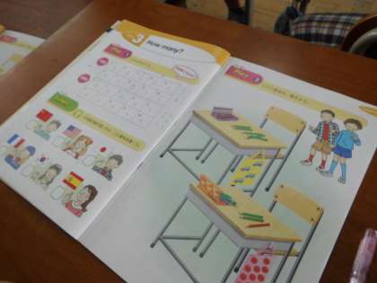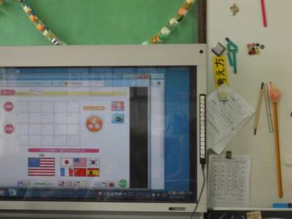 外国語活動の時間の様子です。英語の教科書を使い,音声を聞きながら,自分が聞いたように声を発していきます。