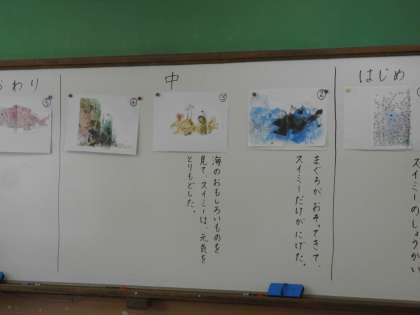 国語の「スイミー」の学習です。あざやかな色の挿し絵がとても素敵です。「黒色が好き。」という子もいて,そんな人にとっては,とても大好きになれるお話ではないでしょうか。また,お家でも声に出してお話を読んで聞かせてあげてくださいね。